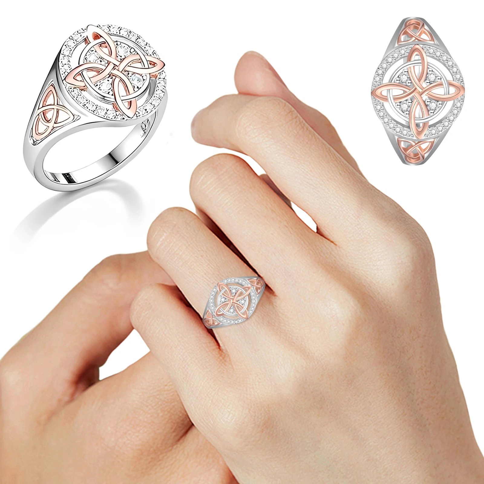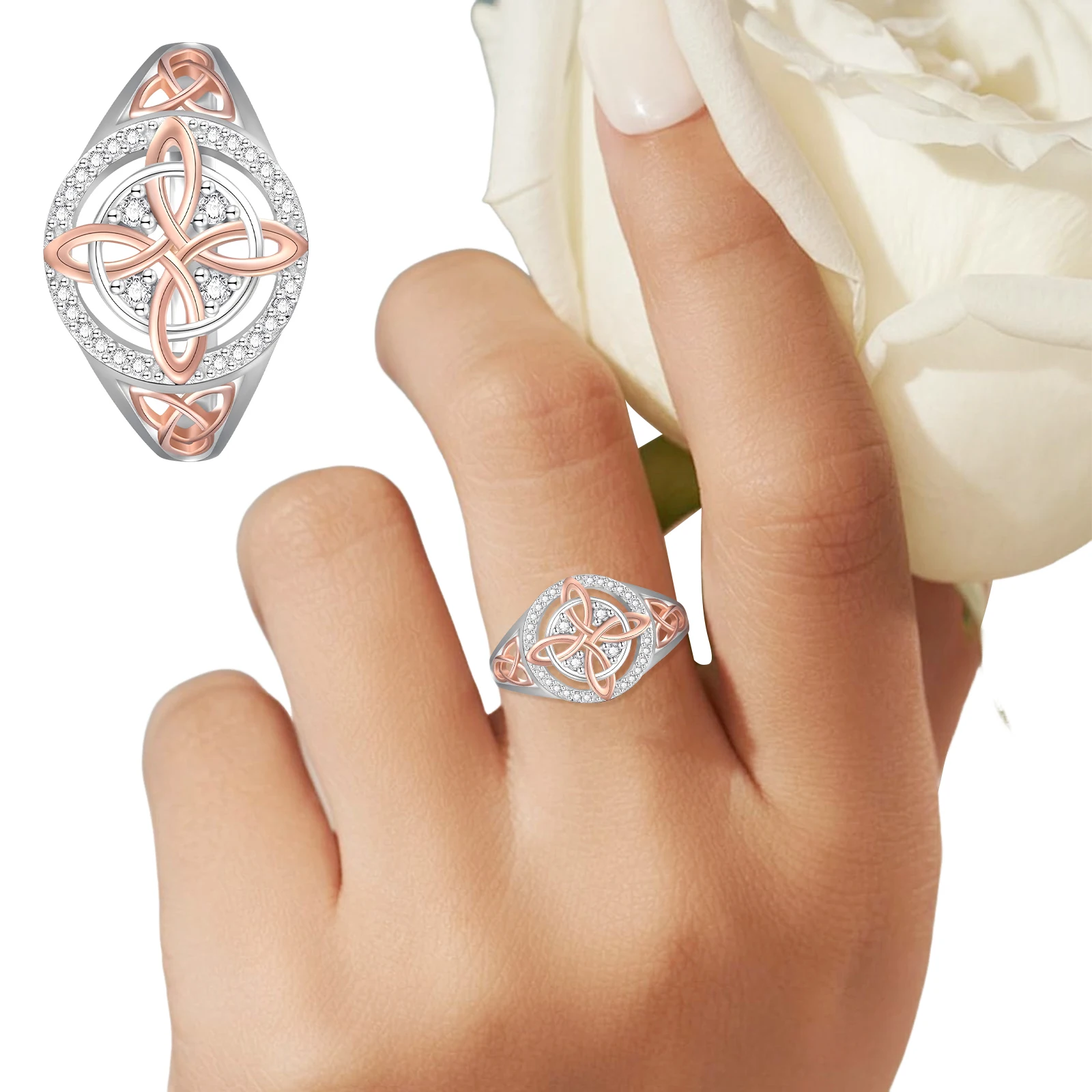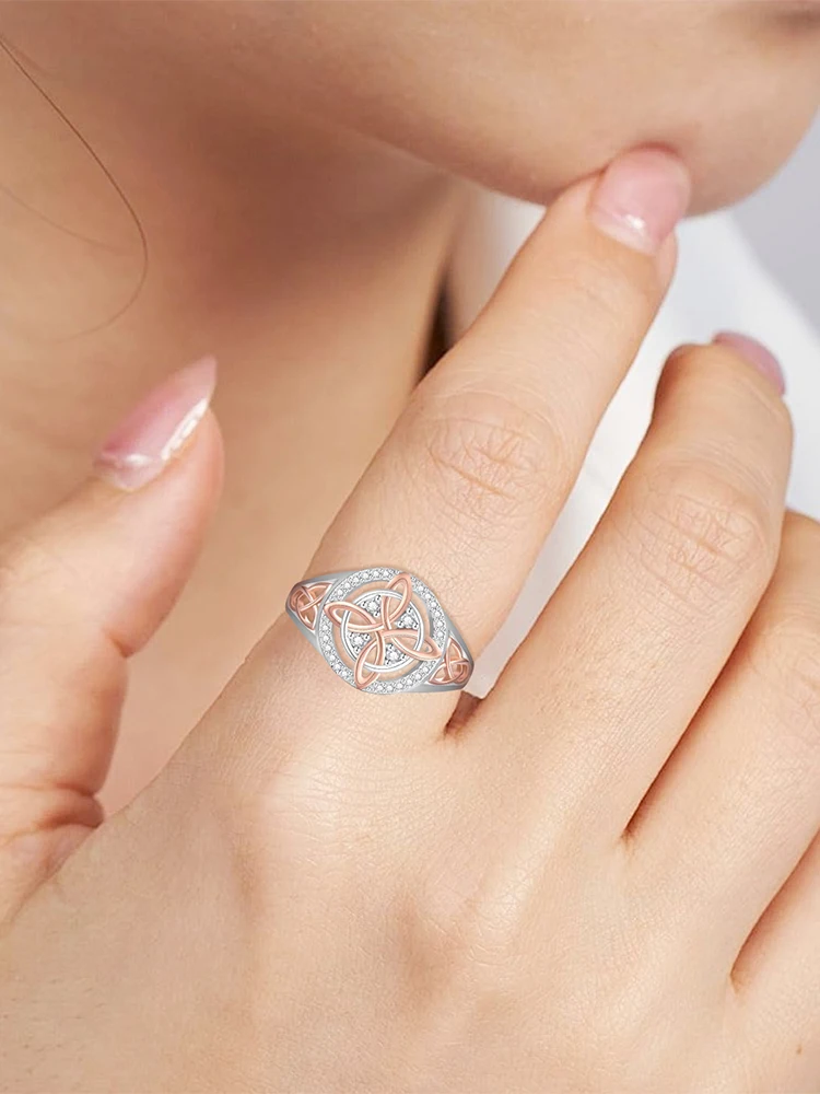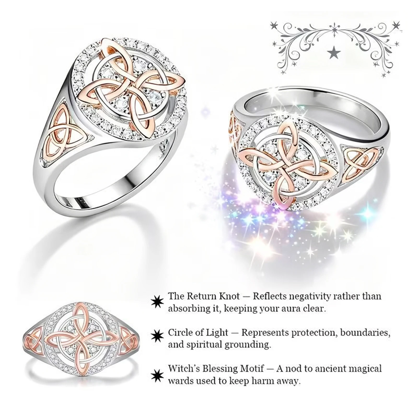 Bicolor Witch Return-Knot Protection Ring Protect Your Loved Ones Witchcraft Knot Ring Jewelry for Women Birthday Gift Mothers Day Gifts Features: 1.Unique Dual-Tone Cubic Zirconia Design: This witches knot ring features a striking blend of dual-tone cubic zirconia and dual-color alloy materials, offering a layered look that elevates any outfit. Suitable for daily wear or mixing with different styles, it instantly enhances your aura. 2.Brilliant Shine, Sophisticated Appeal: Meticulously polished cubic zirconia stones make this celtic knot ring sparkle with a luxurious sheen. Instantly add glamour to your fingertips and showcase sophisticated taste every time you wear it. 3.Comfortable alloy Build: Crafted from smooth alloy, the witch return-knot protection ring feels gentle on the skin and fits comfortably on your finger, ensuring easy all-day wear for any occasion. 4.Exquisite Inlay Craftsmanship: The intricate setting joins cubic zirconia with alloy through fine craftsmanship, guaranteeing refined details and capturing the essence of a truly elegant accessory. 5.Standout Niche Style: Unlike common rings, this witchcraft knot ring boasts a unique, dual-tone design suitable for those who love individuality, letting you stand out as the center of attention.